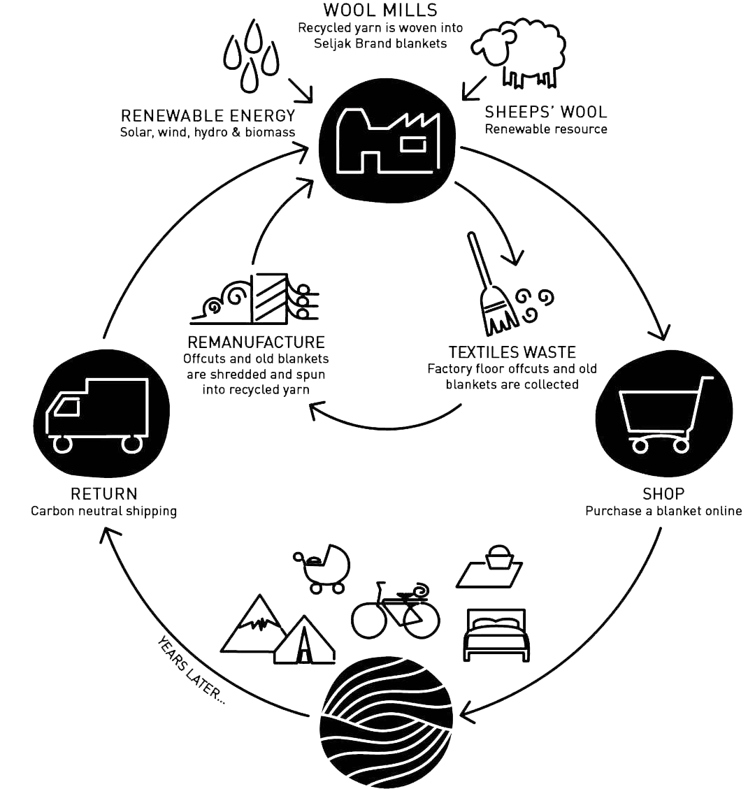 Seljak Brand makes recycled wool blankets out of factory floor offcuts. The blankets are made from a minimum of 70% recycled merino wool or lambswool and a 30% blend of other fibres (recycled mohair, cotton and alpaca) and poly for strength. Wool is a natural fibre that is incredibly hard to replicate - it’s a renewable resource, it is odour and stain resistant, antibacterial, lightweight, breathable and insulating. After your blanket has enjoyed a long, adventurous life we’ll collect it free of charge using a carbon neutral courier service. Back at the mill, we’ll shred it and spin it into new yarn to make future blankets. This circular model allows us to divert waste from landfill and create a luxurious and useful blanket for your cosiness.