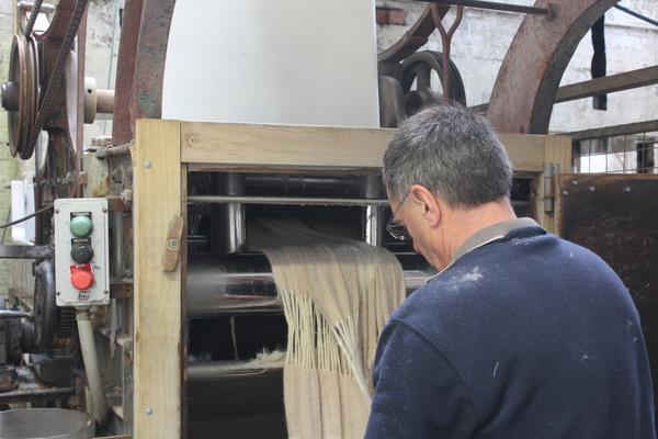 This is a washing process to felt and tighten the weave of the fabric, where the blankets get whipped around big cylinders over and over again. Wool fibres have many tiny teeth that lock closer and closer together with warm water and friction. Milling also determines the width of the fabric as it shrinks.